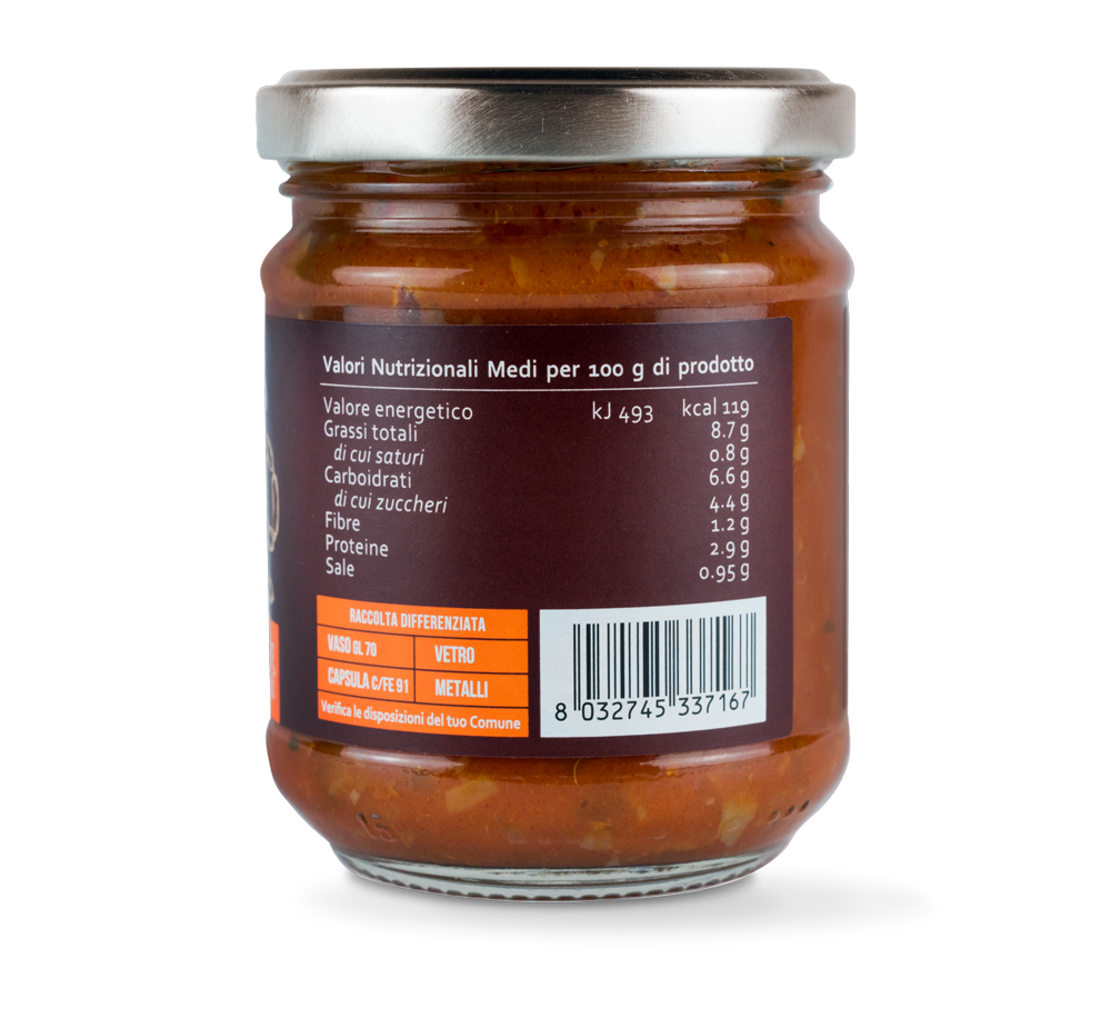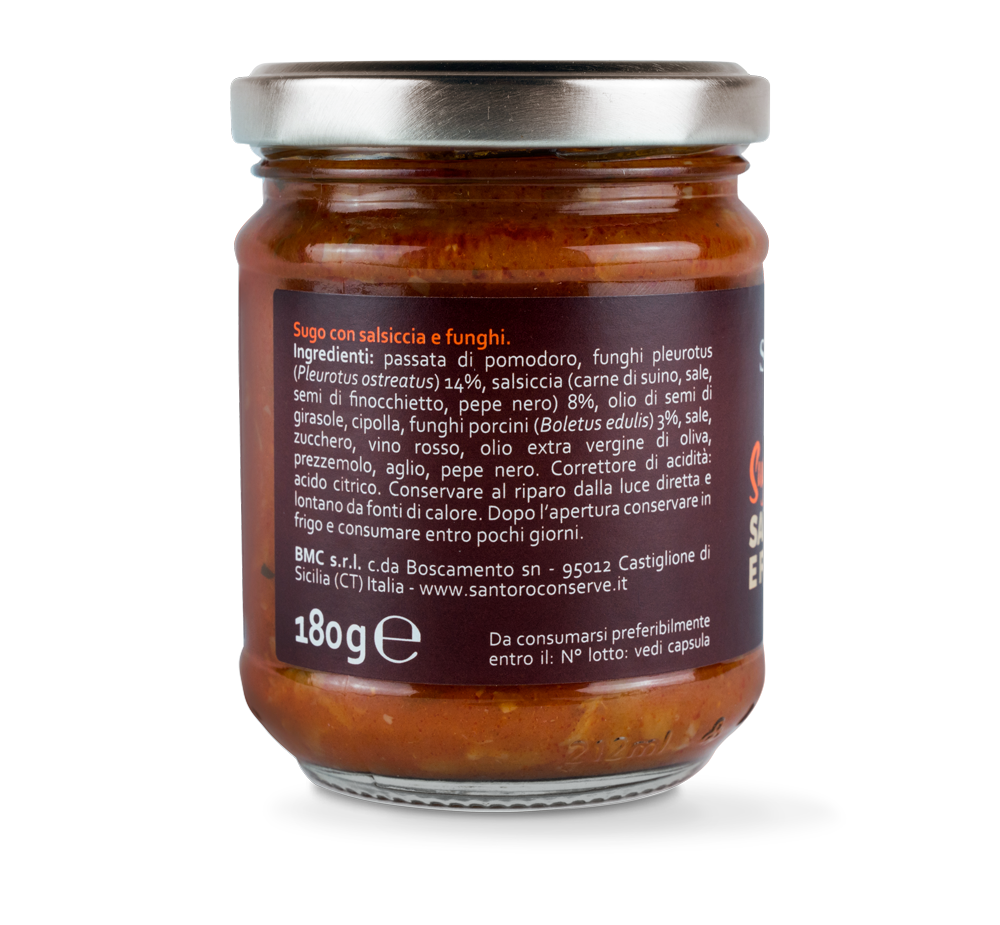passata di pomodoro, funghi pleurotus (Pleurotus ostreatus) 14%, salsiccia (carne di suino, sale, semi di finocchietto, pepe nero) 8%, olio di semi di girasole, cipolla, funghi porcini (Boletus edulis) 3%, sale, zucchero, vino rosso, olio extra vergine di oliva, prezzemolo, aglio, pepe nero.